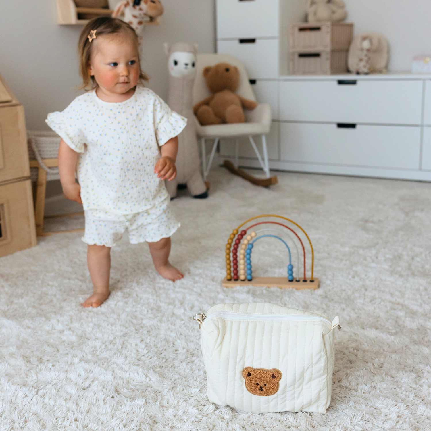 Le sac est pensé pour y glisser le set repas vide ou une tétine, un petit doudou, quelques couches et les lingettes. Il permet à bébé de garder ses repères lors des sorties.